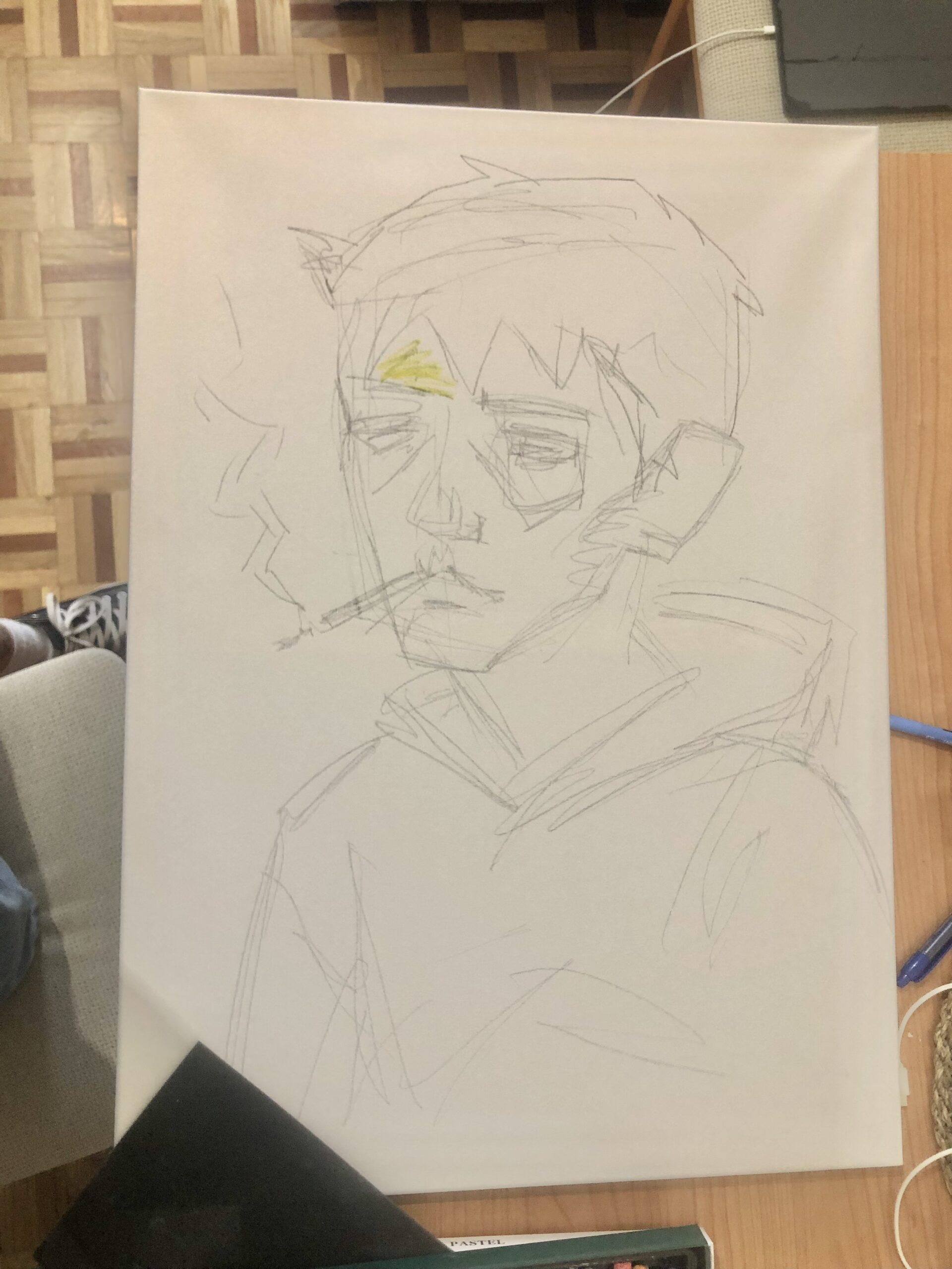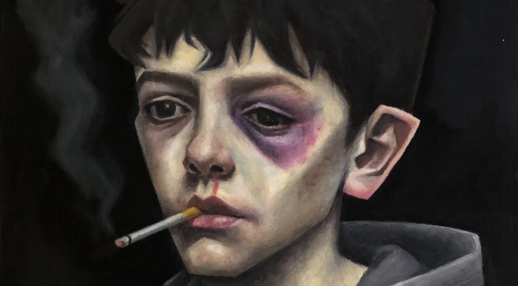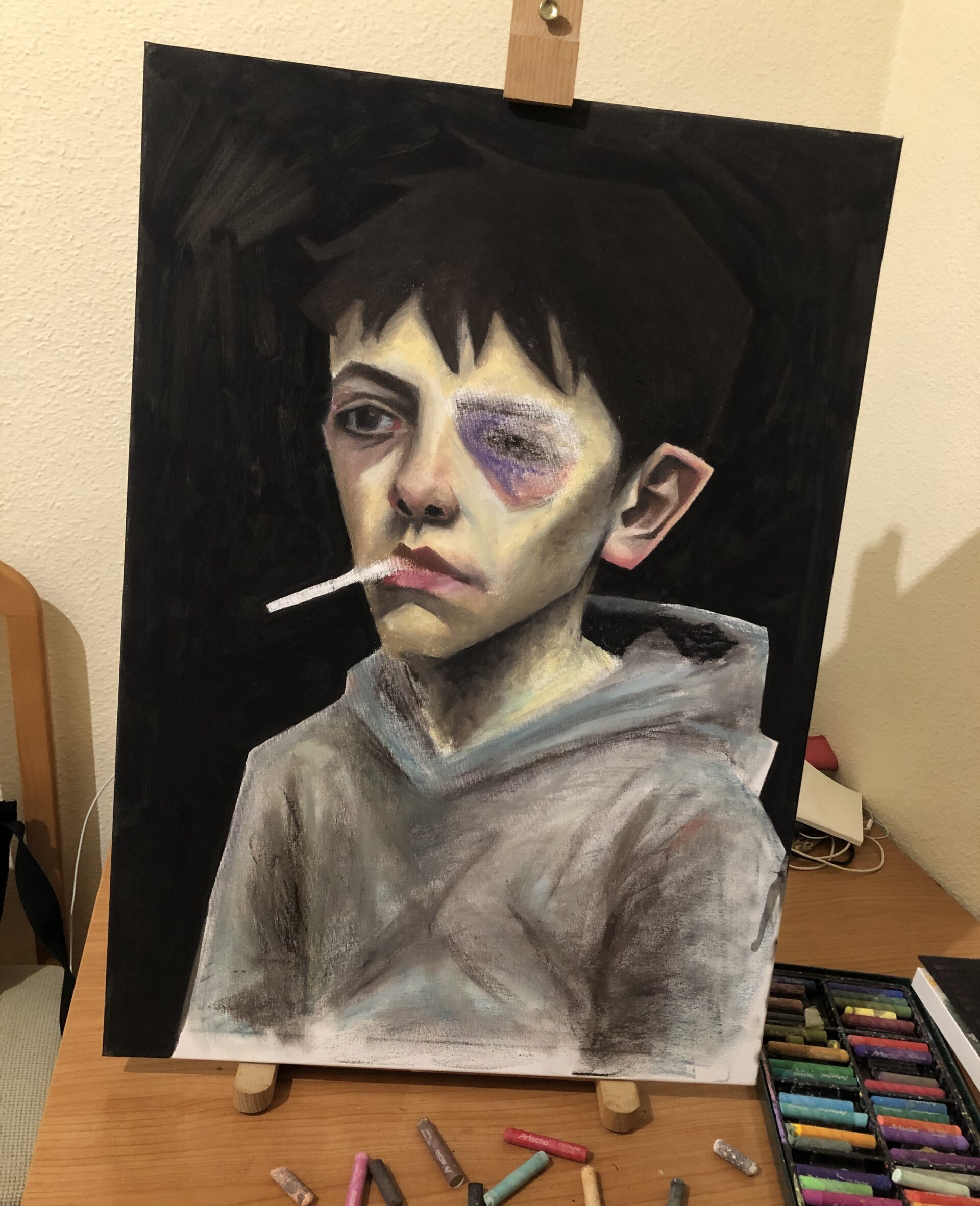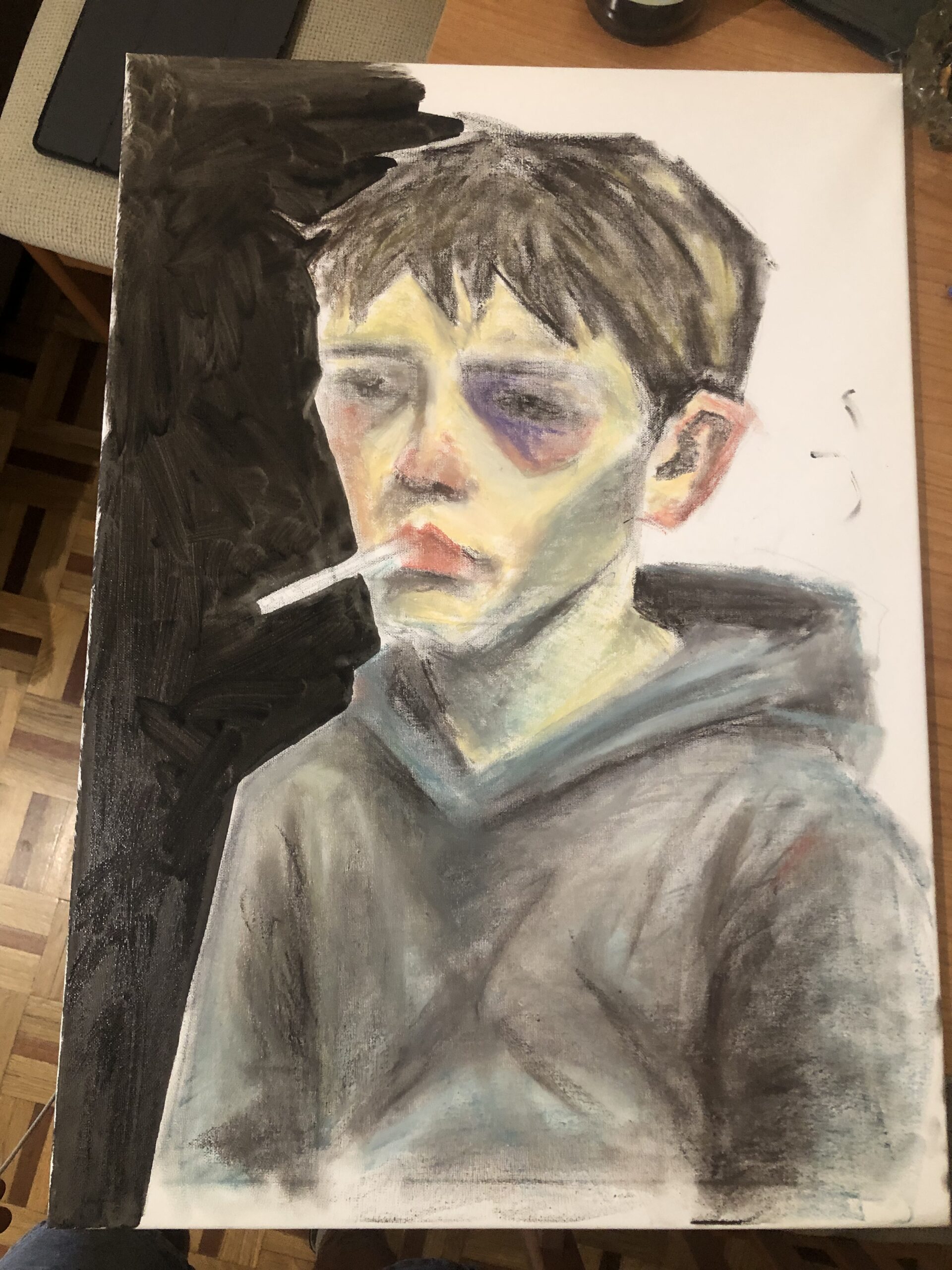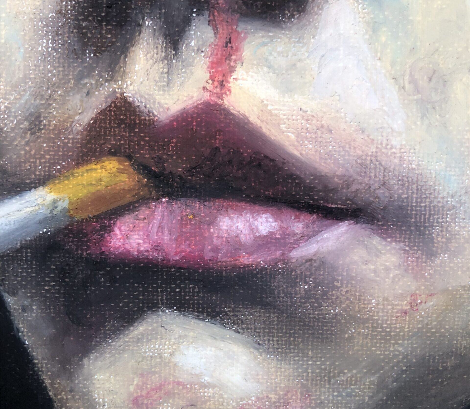Esta obra es el resultado de un torbellino de emociones, una representación del caos que llevo dentro. El rostro, con sus marcas de lucha y su mirada perdida, refleja esa impulsividad, mientras que el cigarrillo simboliza la calma y la meditación, el momento en que conecto con mi interior. Es un recordatorio de que, incluso en los momentos más oscuros, la pintura puede ser un refugio.