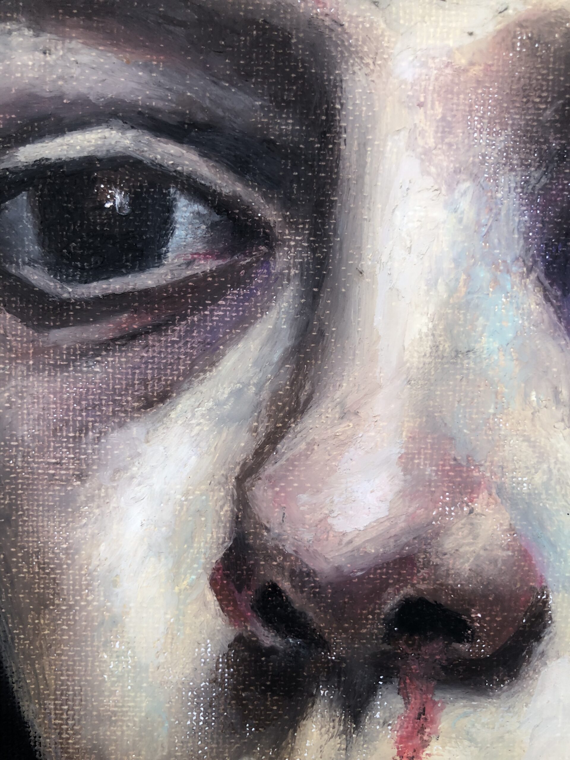 Pinté esta pieza en tres días usando óleos pastel sobre lienzo. Fue un proceso intenso, pero gratificante. Me sentí particularmente conectado al pintar los detalles de los ojos y la boca, ya que son los que mejor comunican el silencio y la profundidad de esta historia.